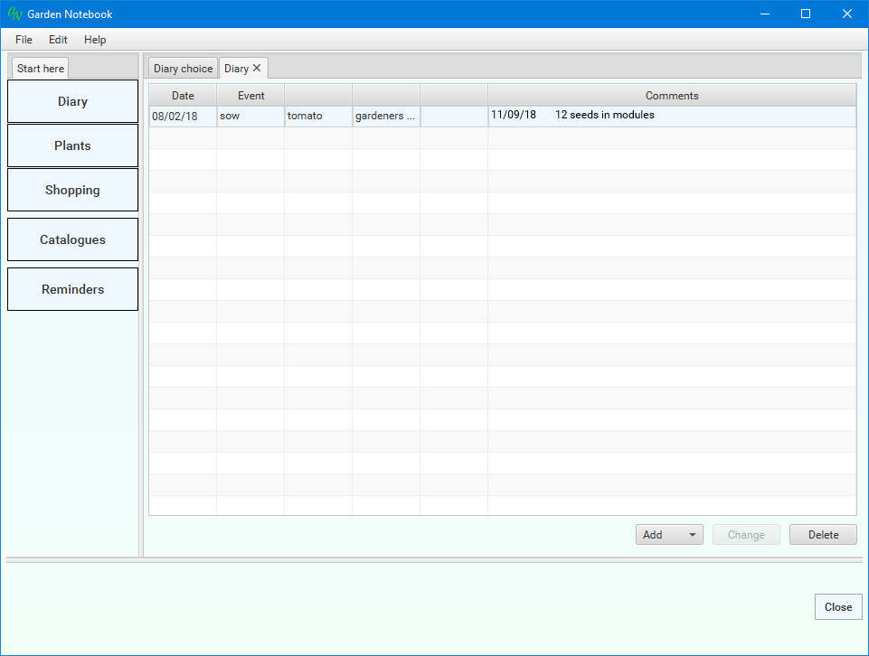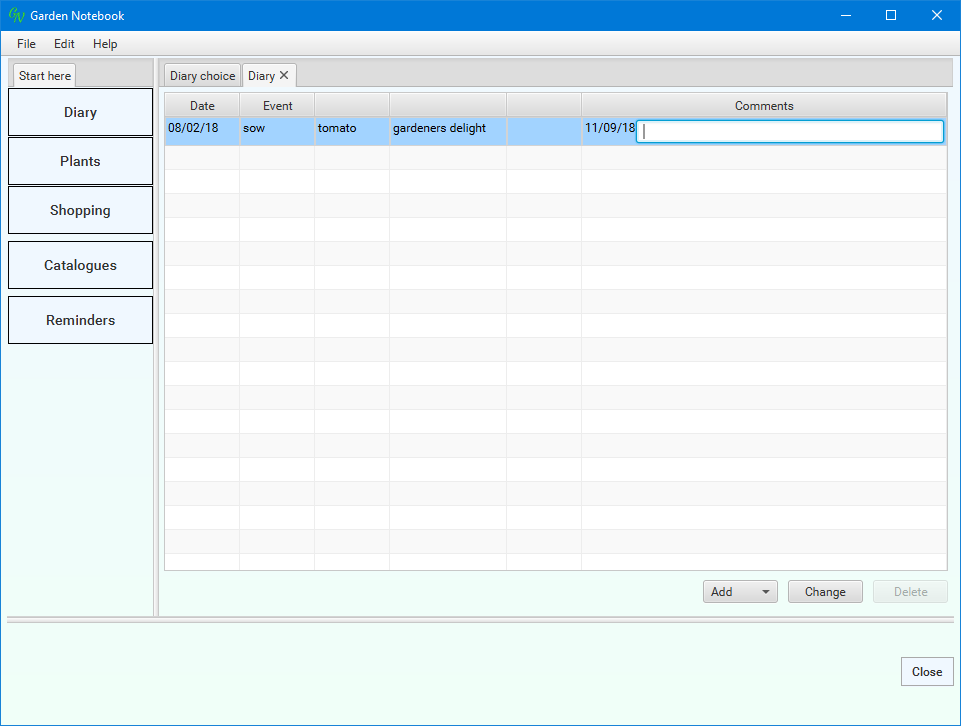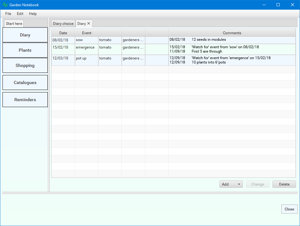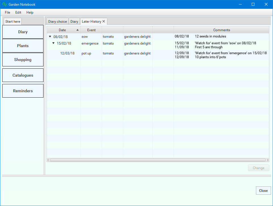 (I've changed the dates for narrative purposes). The application has done a bit of work for you - I always forget something, somewhere, so these reminders are quite a help. Select the new entry ('emergence') in the list then click the 'Change' button: