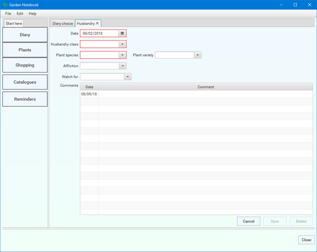 You use this window to select which parts of the Diary you want to see - you can select time spans, specific types of entries and entries for specific plant species and varieties.