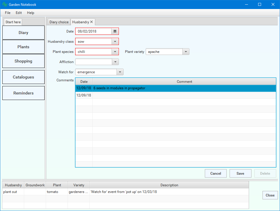 Go to the Diary choice page and click 'New' on the Husbandry line, as before. Select 'sow' as the activity but this time we are going to record sowing a plant that's NOT currently in the Plant Catalogue.