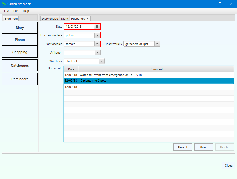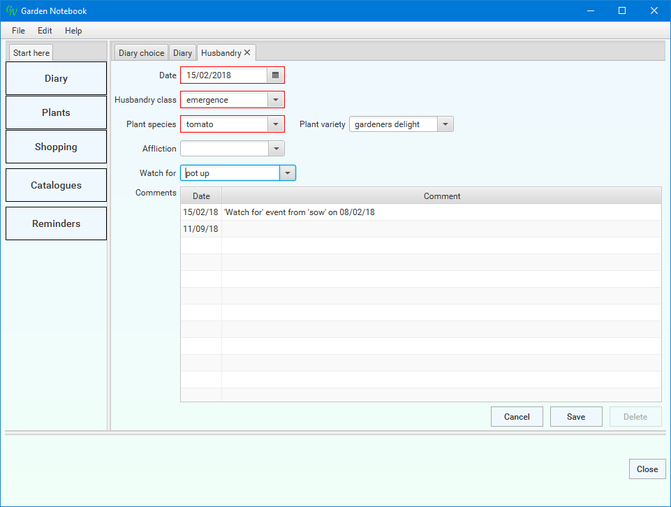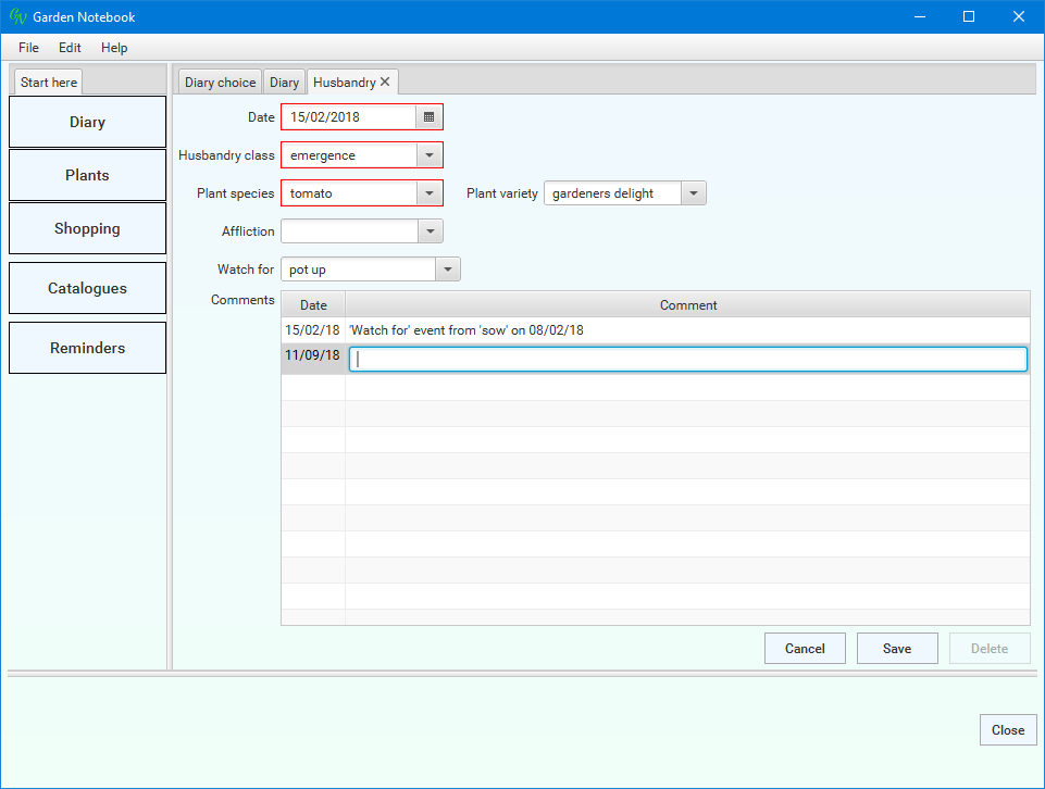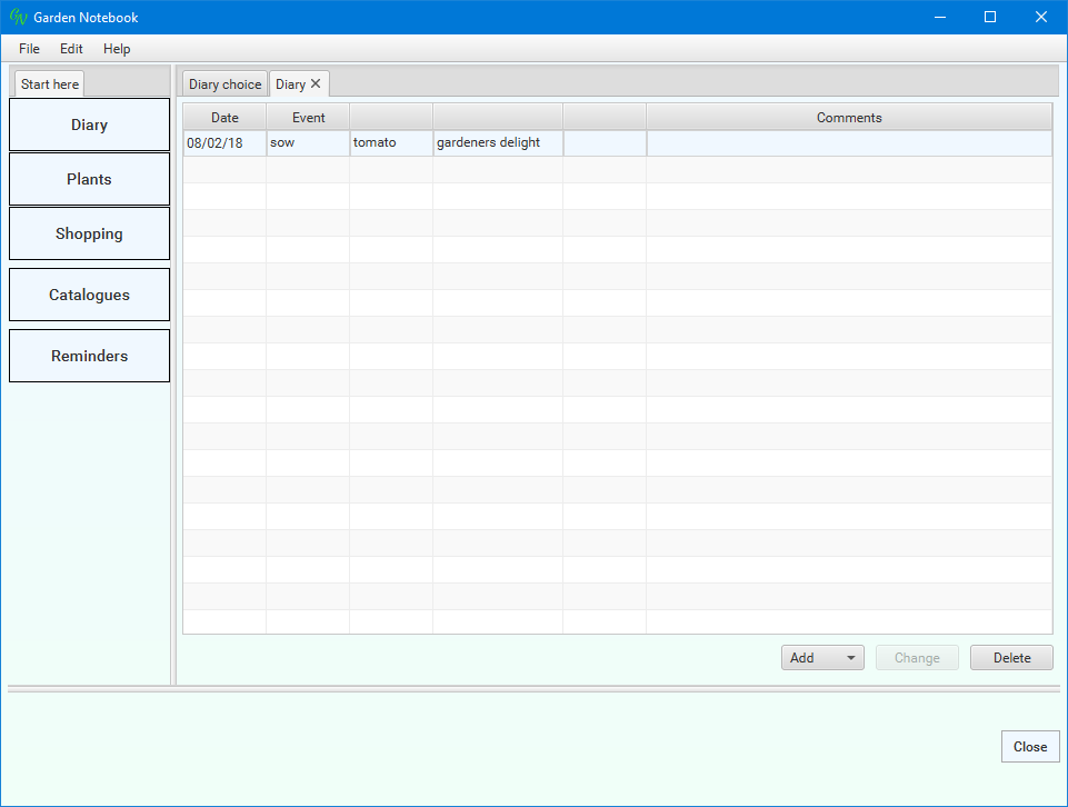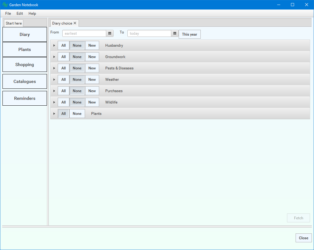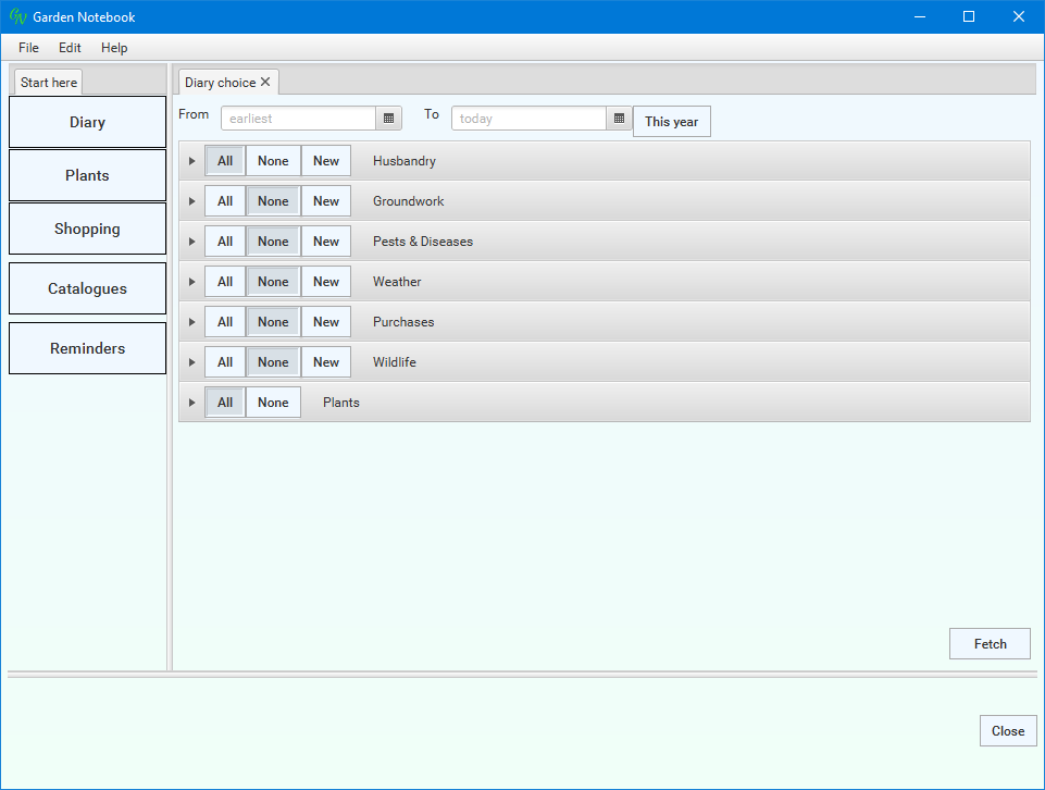 You use this window to select which parts of the Diary you want to see - you can select time spans, specific types of entries and entries for specific plant species and varieties.