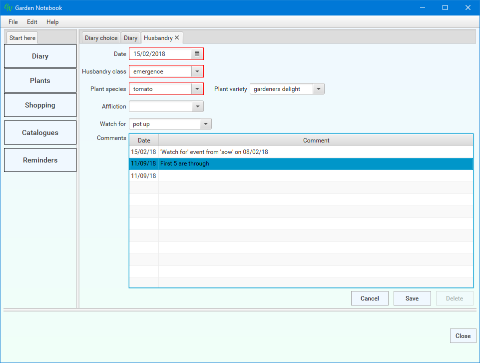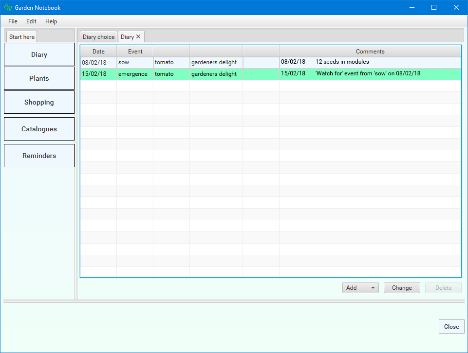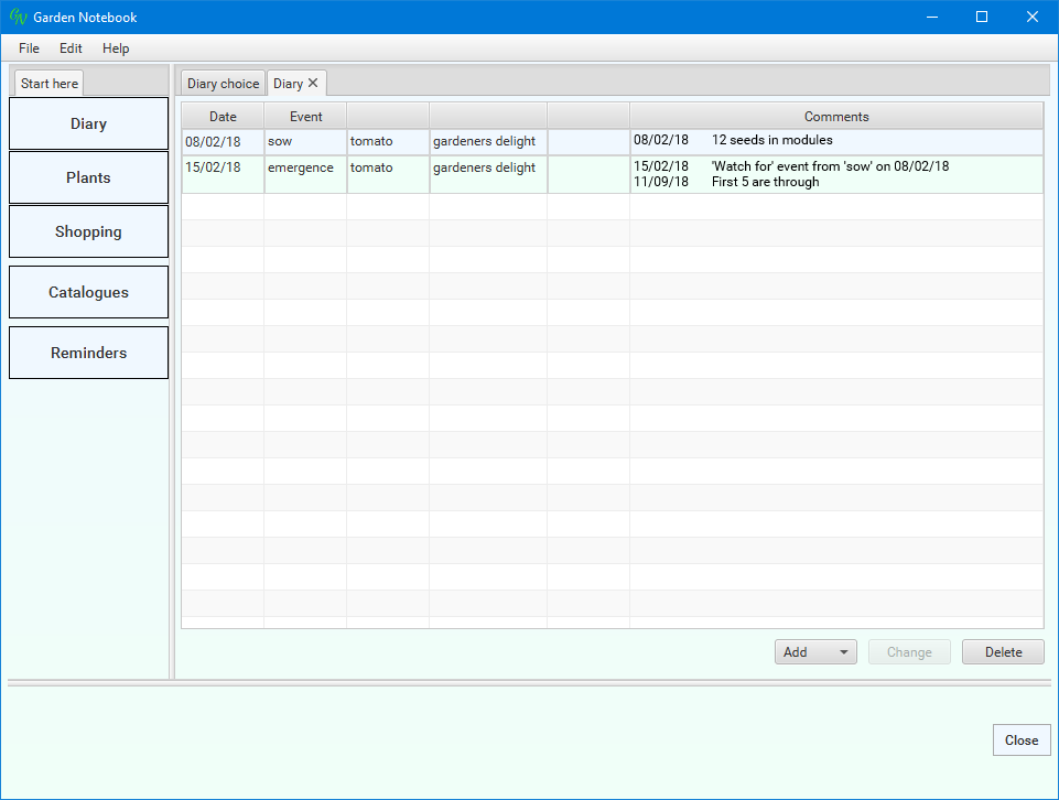 (I've changed the dates for narrative purposes). The application has done a bit of work for you - I always forget something, somewhere, so these reminders are quite a help. Select the new entry ('emergence') in the list then click the 'Change' button: