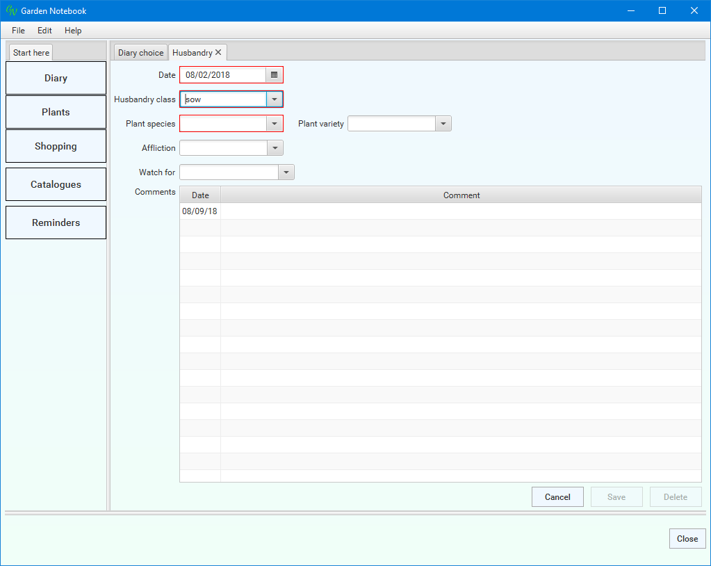 I've changed the 'Date' value, this will default to today's date for a new entry. Open the drop down list labelled 'Husbandry class' (click the arrow to its right), scroll down the list and click 'sow':