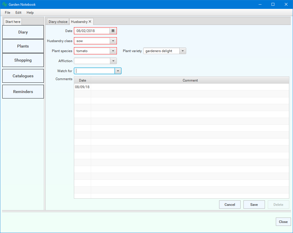 Of course, we could have put the Comment in when we first created the diary entry; I'll show you this shortly. For now, close down the application (click the Close button or click the Close item in the File menu) and re-open it.