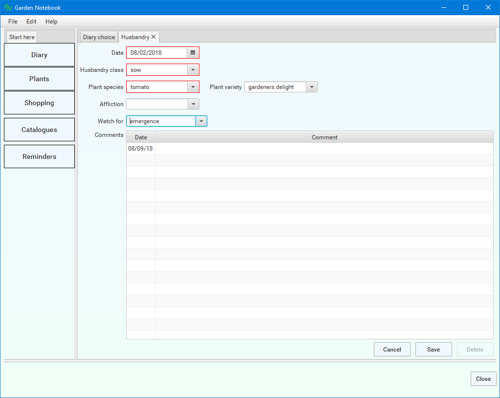 Now open the Plant species drop down, scroll down the list and select 'tomato' and the Plant variety drop down and select 'gardeners delight':
