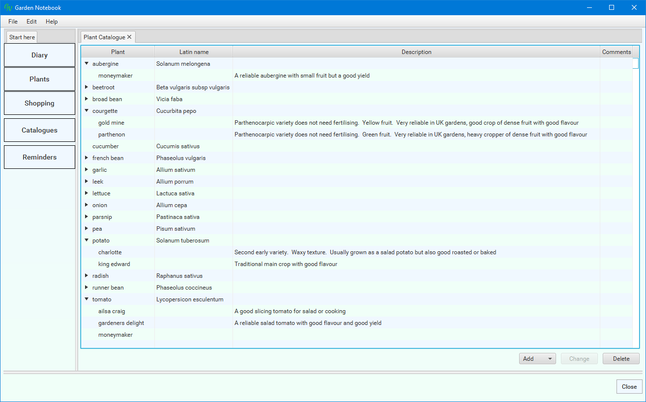 The plants I've included obviously reflect my preference for vegetable gardening. It is very easy to add or remove plants from this catalogue.