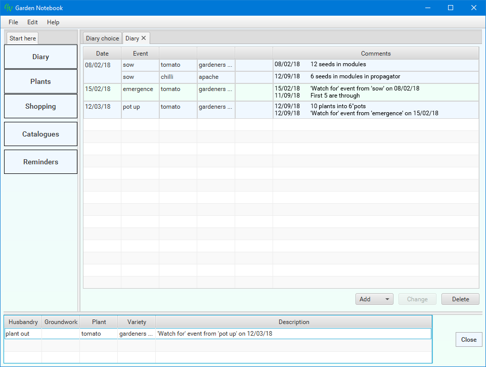 I emphasised that you must type the entry into the empty box. If necessary clear any text in the box in the usual way. If you type into a box with text in it (so that you get something like 'tomchilliato') the application will add a plant with that name. If you want to change the name of a plant, go to the Plant Catalogue, select the species or variety and use the Change button to get a Plant editor. You can safely change the name (and anything else) here.